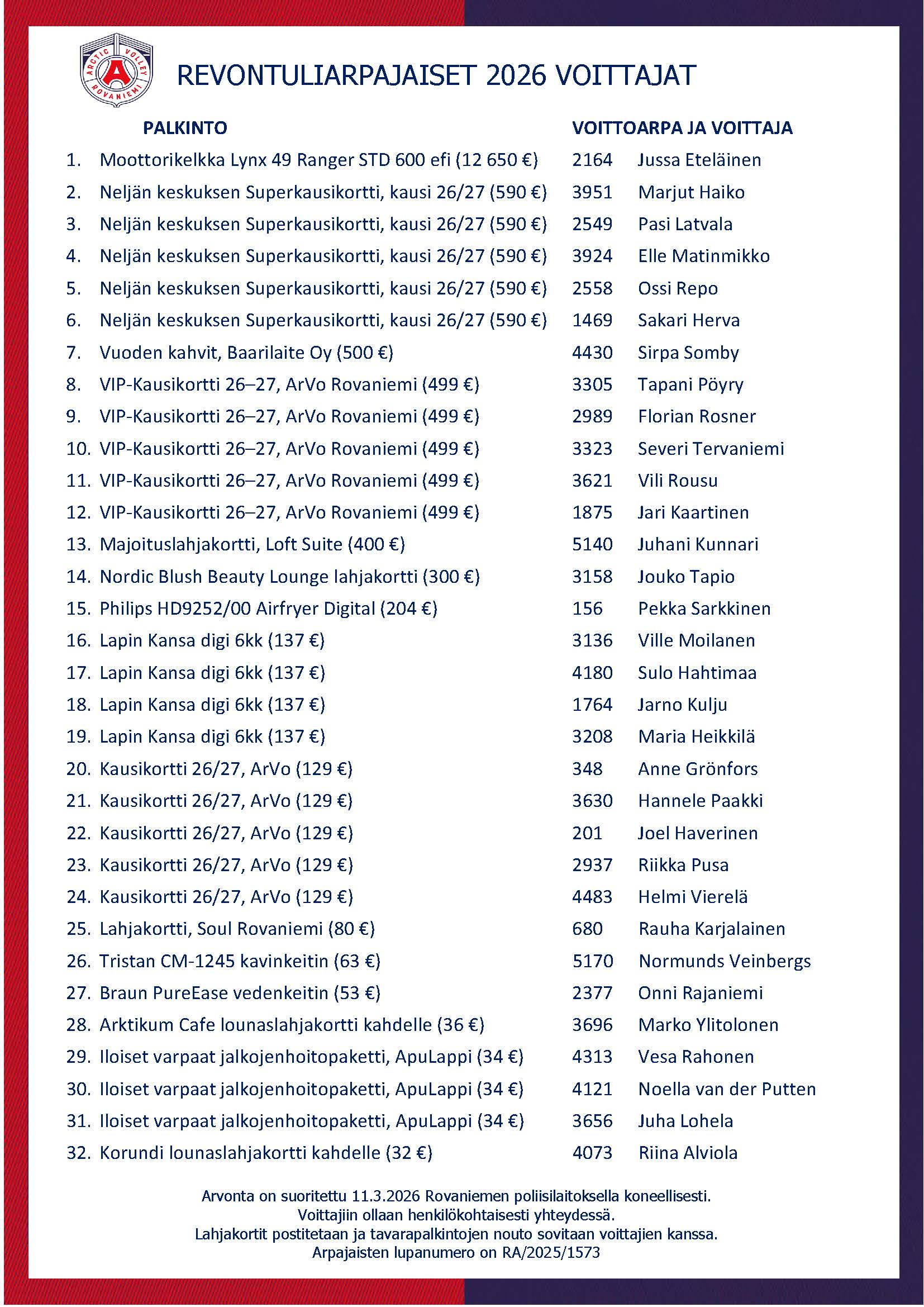 Palkinnot on arvottu 9.3.2026 Rovaniemen poliisilaitoksella koneellisena arvontana.